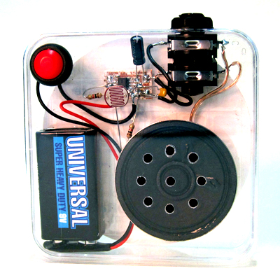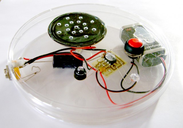 Back in 2009, my nephew’s birthday was coming up and I needed a gift. So I looked around my studio and found that I had enough parts to make something that looked like this. It made a lot of funny beeps, so I called it “Beep-it,” after the Cornelius song of the same name. The case is a big plastic petri dish and the circuit is a 555 oscillator with photocell control.