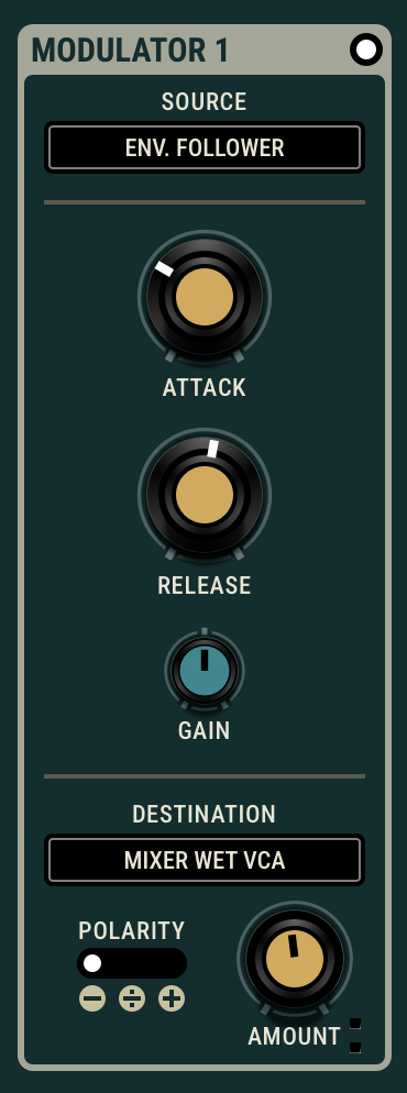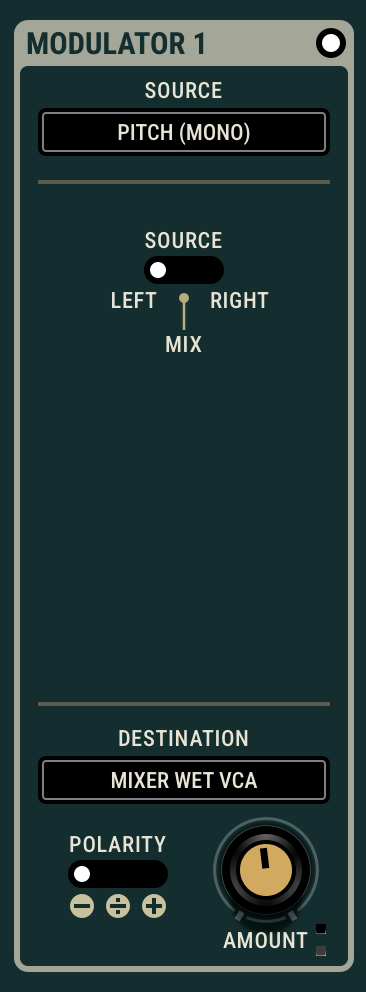• Source options for modulation: choose sine, triangle, or rectangle waves, or input RMS, envelope follower, or mono pitch tracking. (And there are extra targets, thanks to enhancements elsewhere.)