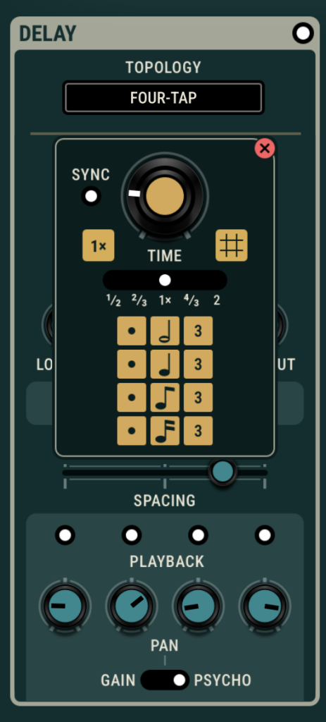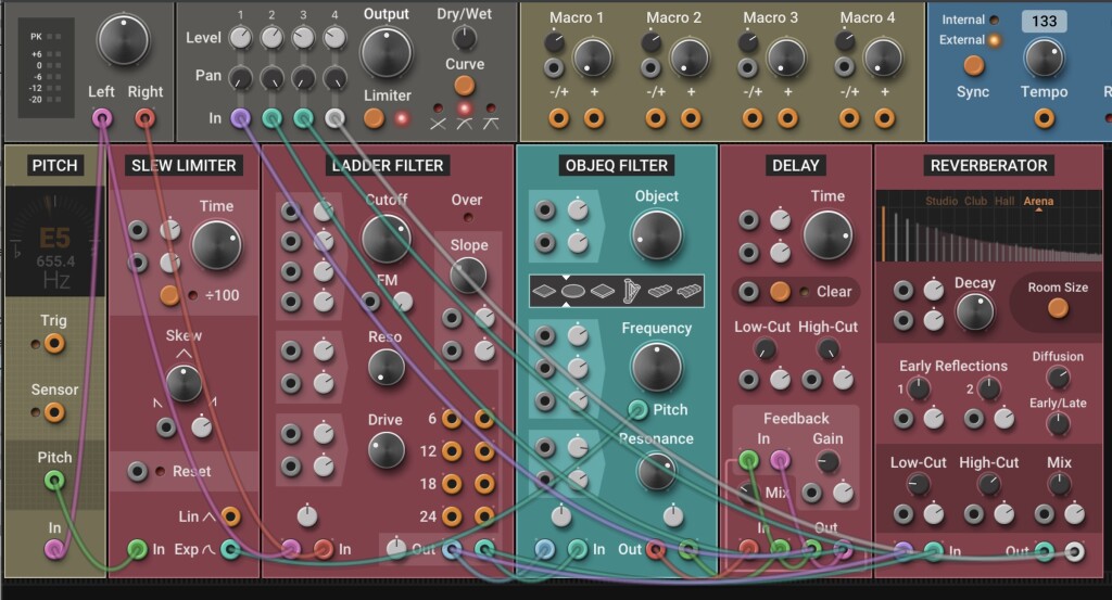 Here’s one example, using pitch detection (and adding slew limiting to its output), plus some other ideas. I’d need to do more work to replicate the 4-tap echo, though! So you do get more flexibility this way, but I’m also glad to have the option of the Objeq Delay 2 UI.