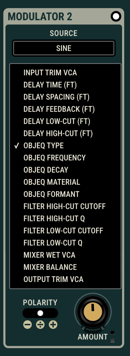 • Source options for modulation: choose sine, triangle, or rectangle waves, or input RMS, envelope follower, or mono pitch tracking. (And there are extra targets, thanks to enhancements elsewhere.)