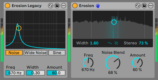 Erosion in Live 12.4 gets some subtle but significant changes, and they’re more than just skin-deep. You can compare the UIs. The improved layout includes real-time visualization of the sound (plus that cute animation of the width). It also gets rid of fixed choices for Sine / Noise and Noise / Wide Noise, replacing each of those with a continuously-variable controls for Noise Blend and Stereo, respectively.