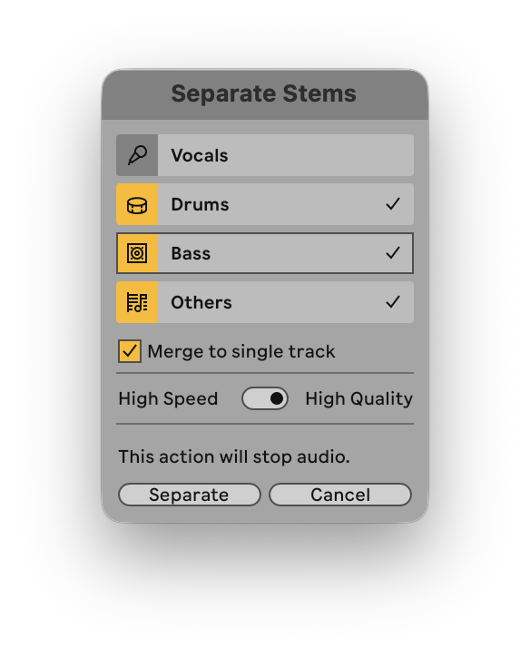 - Stem Separation shows total progress when you’re in High Quality mode — so it’s easier to see how long you have to wait (previously it showed each stem separately)