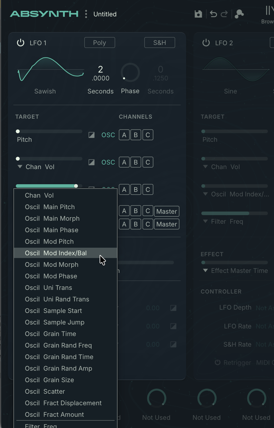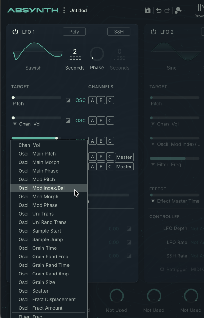 At the top of each LFO, you’ll see a toggle for mono or poly. In mono mode, there’s no retriggering at all — the LFO will just free-run even as you play more notes.