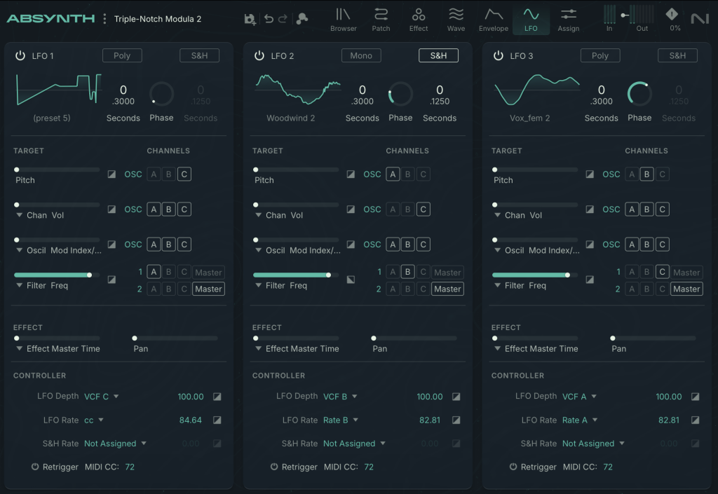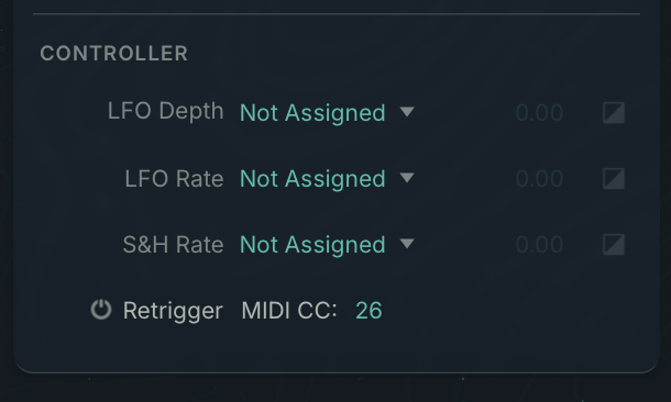 There’s also now an additional retrigger option that you typically don’t see in a soft synth. You can manually retrigger each of the three LFOs at any time when the LFO is in mono mode. You simply assign a MIDI CC to each:
