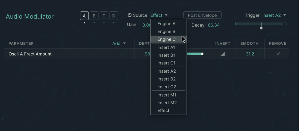 In true Absynth spirit, this feature is extensive and powerful. Sure, you could have thrown in one envelope follower and called it a day, but this is Absynth. So you get not one, but four audio modulators. You can choose a source for each from the various engines, inserts, and effects. You can choose pre- or post-envelope. You can choose which module you want to trigger at the signal threshold. And you can freely pick parameters, plus set depth, inversion, and smoothing for each independently.