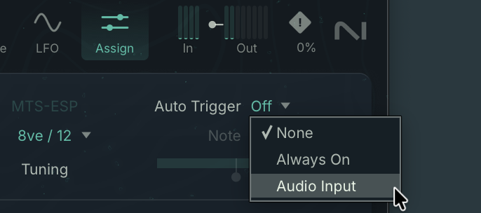 Auto Trigger is handy for sound design or droning — go to the Assign page, and on the top you’ll see options for Always On (making Absynth sound continuously on a note of your choosing), or Audio input (useful in FX mode).