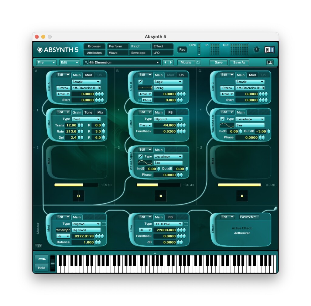 Cloud Filter, Aetherizer with high density mode. These are “just” HD switches, but wow, do they open up another character. Introduced in Absynth 5, these were already unique effects. Aetherizer is a granular delay with comb or bandpass filters that you can introduce in the feedback loop, and Cloud Filter is the filter version for use inside the synth structure. In V5, these produced some interesting pitched feedback effects. But with the high density modes, they transform into dense, rich fogs of sound that shift in complex ways. More than just an effect, they become an integral component of the sound patches. That has been my experience with Brian’s Rhizomatic software, too; the effect isn’t a bit of icing at the end, but part of how you imagine the entire patch as a resonating instrument. And the fact that you can go back to the lo-fi version of course means you appreciate the “vintage” sounds as an intentional technique, not a limitation.