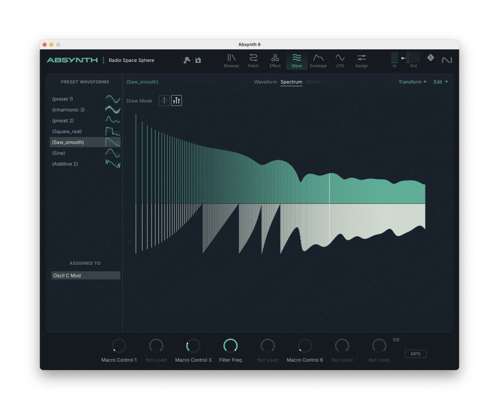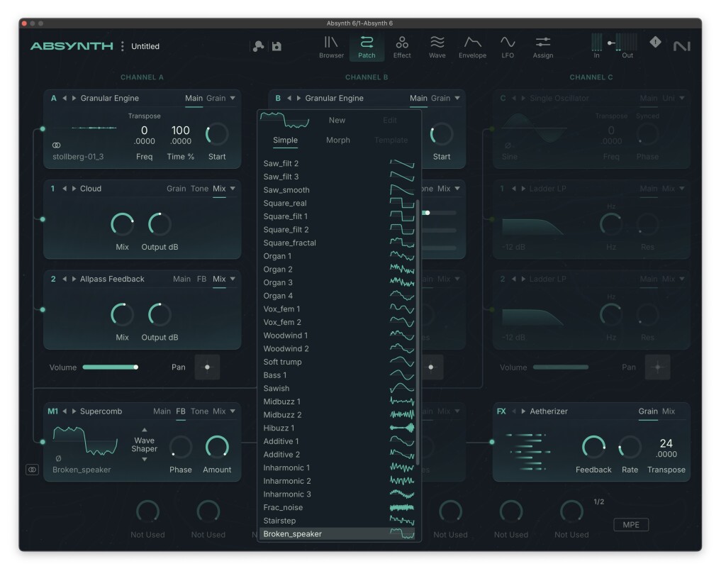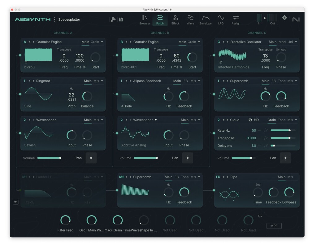 MPE and poly aftertouch support. This is equally major, as Absynth was always designed to be a “playable” synth. MIDI Polyphonic Expression makes Absynth a killer new engine for something like an Osmose or Haken Continuum or even Push 3, and the addition of poly AT expands that to a wide variety of keyboards (and Ableton Move, even).