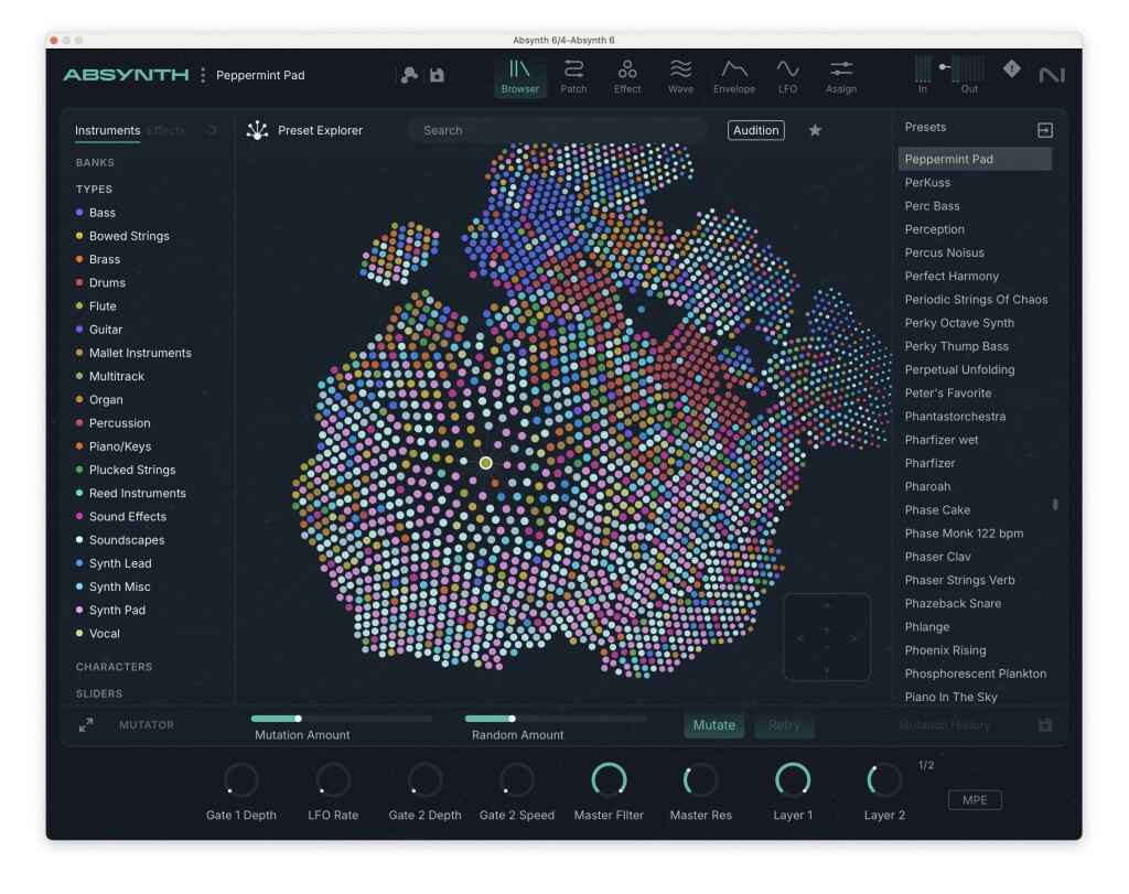It’s important to note what this isn’t: there’s absolutely not AI involved in constructing sounds. It’s instead a case of AI making the software more huamn, allowing a messy, playful interface. Some of us went into music because we hated rigid categorizations and columns and rows, anyway. Fun as this is, it’s also the feature I used the least, because I was busy making new sounds. But it also ensures you’re never stuck on a blank screen or with one preset and a menu, because the software now drops you in this star map instead when you launch.