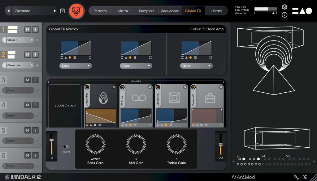 Look in deeper, and you can add additional effects and modulation. Each of those shaded X/Y graphs allows you to map parameters by LFO or x/y/z parameters – see that wireframe visualization on the right-hand side of the screen. Unlike a lot of sample libraries, you’re not restricted to the way this has been set up; you can add additional processors (“Colours”) and then shape those with macros. All of that is also quite fast, so you can “shade in” a preset you like or move it in a different direction.