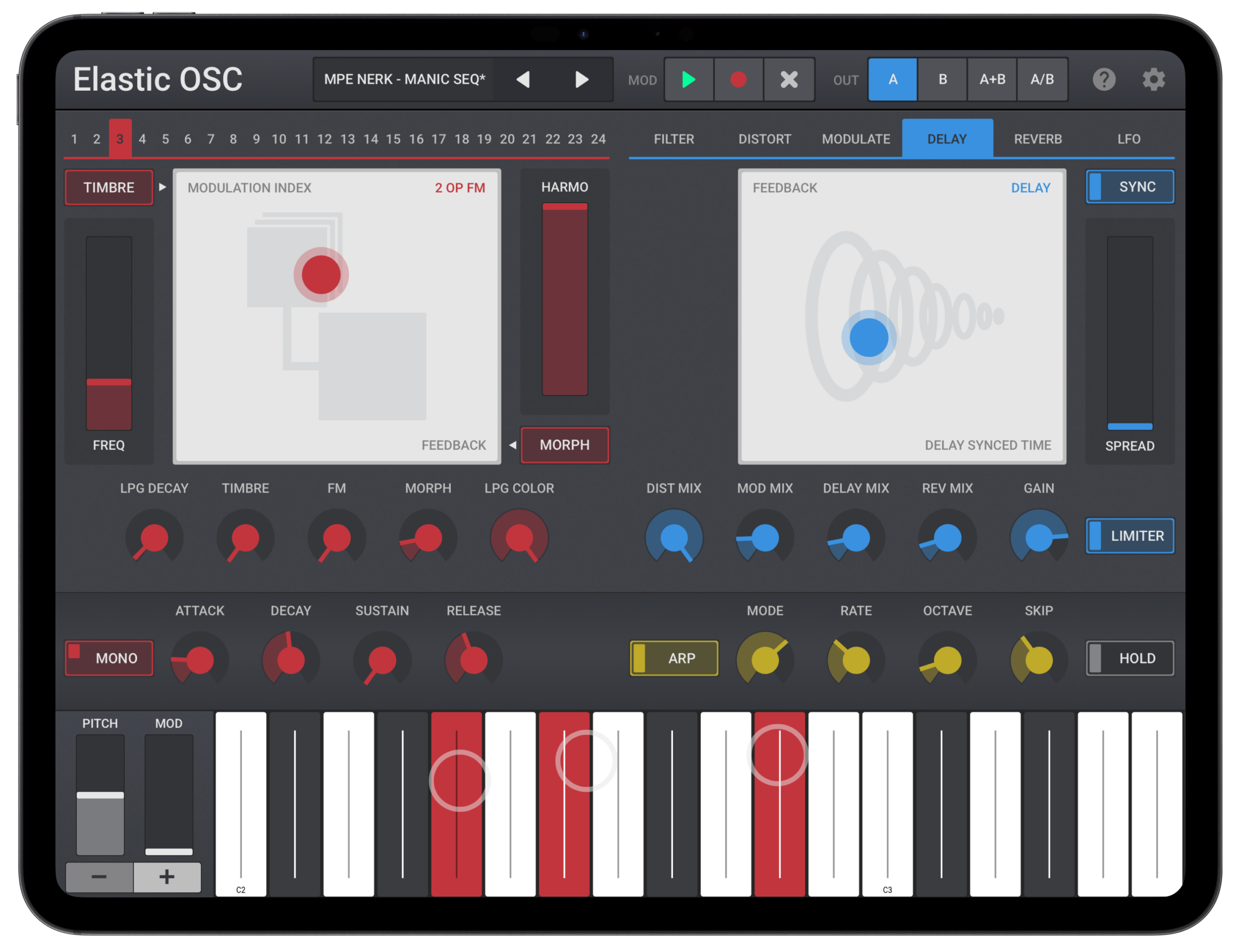 Now you get MPE support. On the iPad itself, that means just using the two-axis touch control on the onscreen keyboard. But this also transforms the app into a useful voice for any MPE controllers you may have handy, as revealed here with the Erae 2 controller: