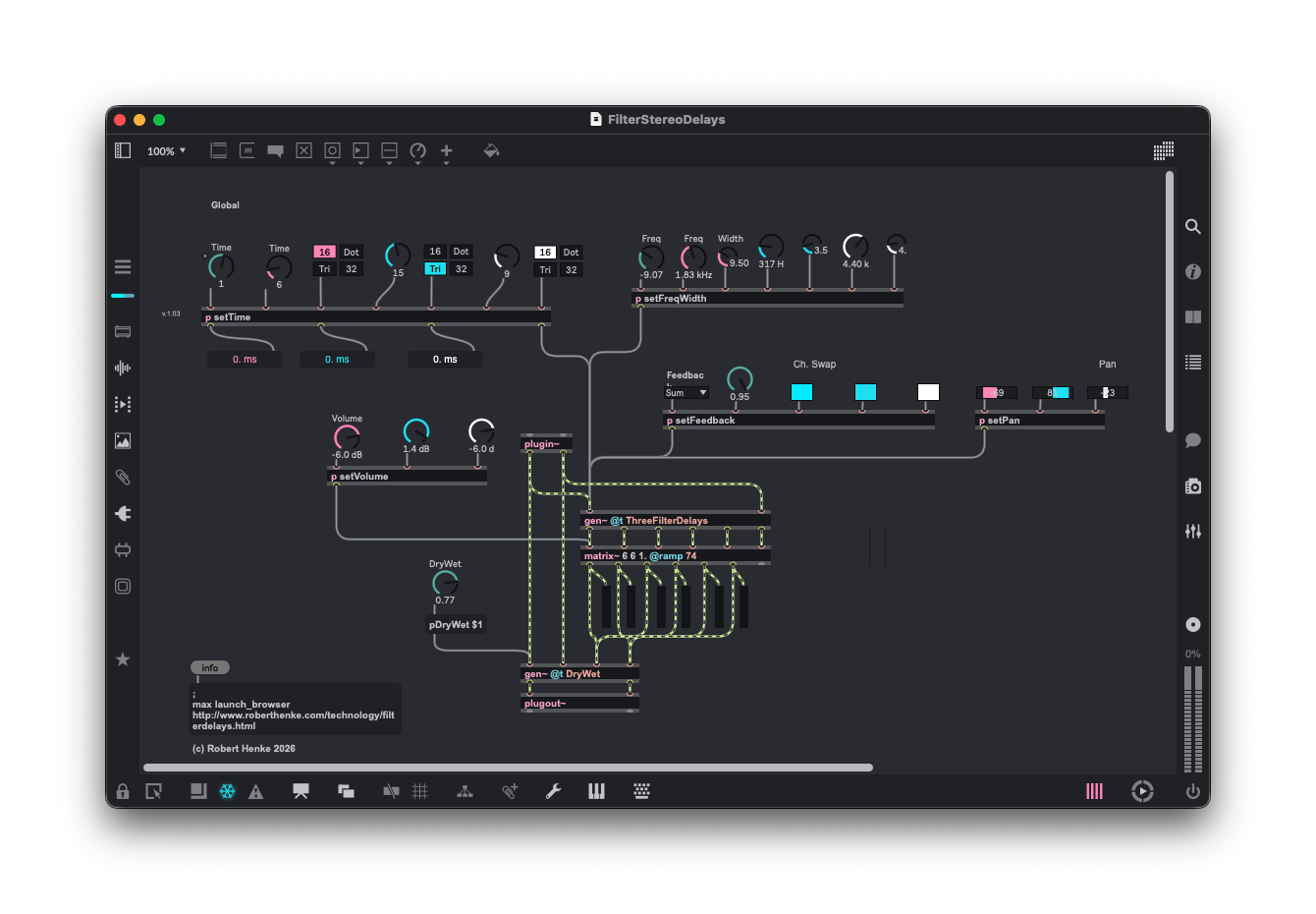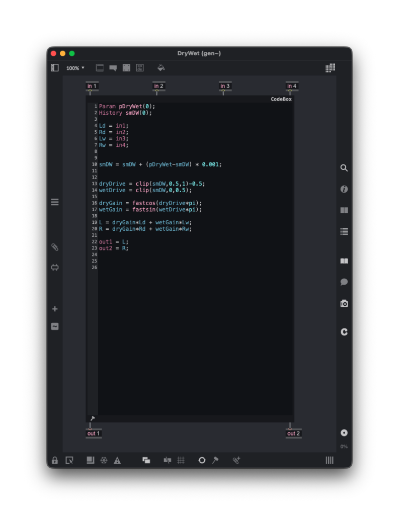 Opening it up reveals an elegant, economical design. It’s actually a great demonstration that while the lower-level gen~ environment may sound scary, it can actually take less work to express something in gen~ than with the usual patches. (I do still wish Pd had something like gen~ in it!)