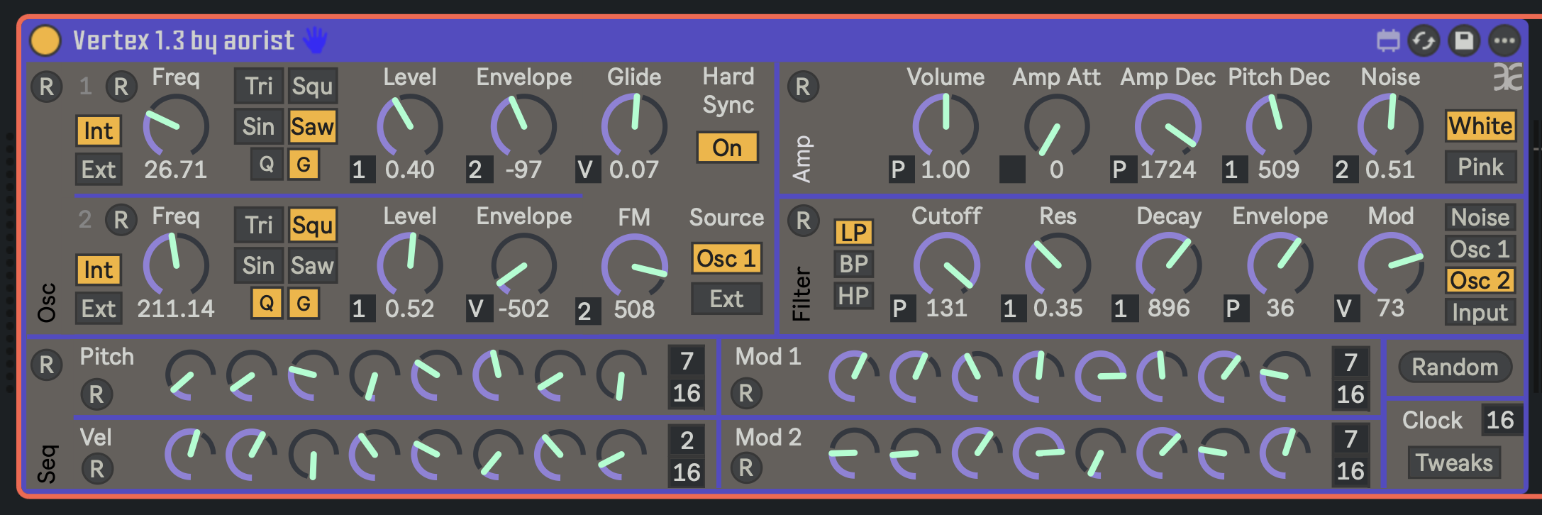 - 2x triangle/saw oscillators with pitch envelope, glide, quantize, hard sync and FM