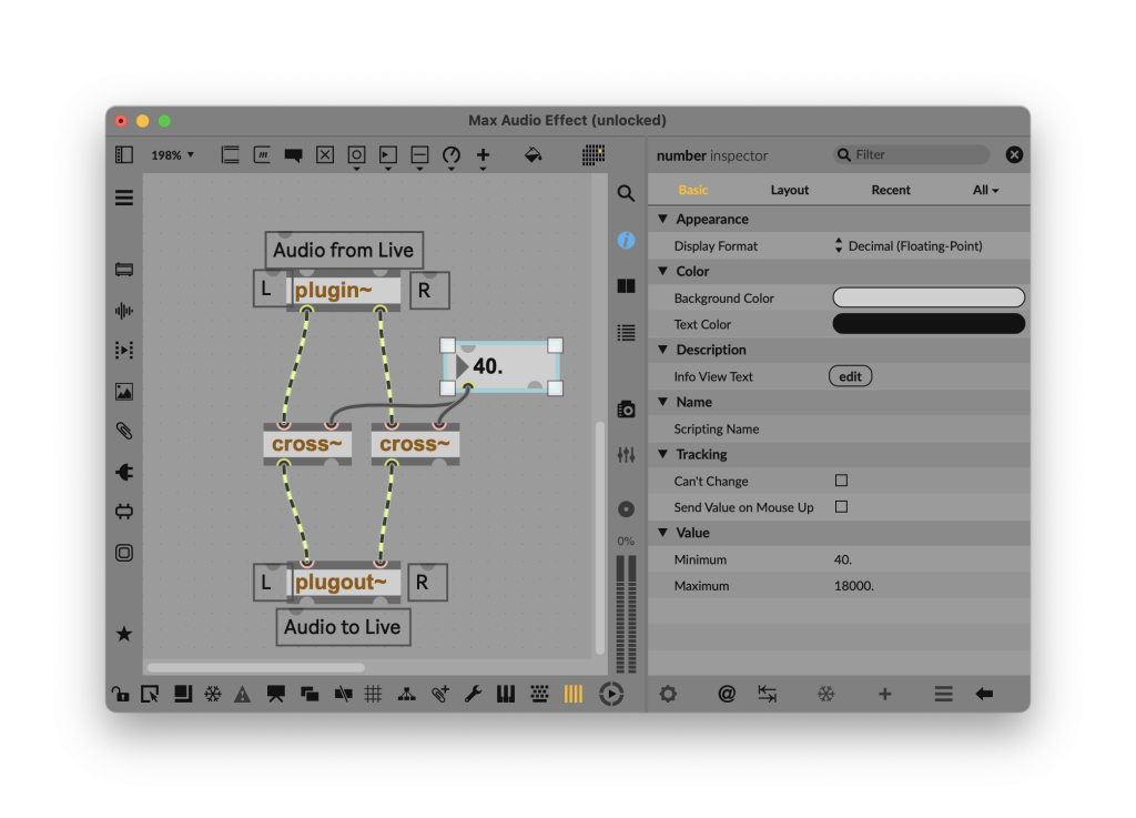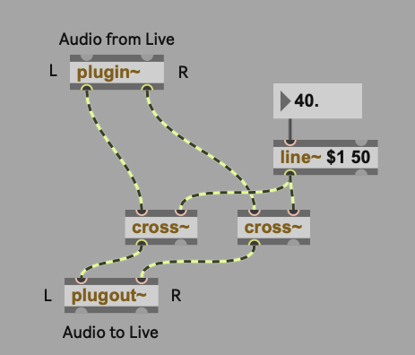 cross~ is mono, so we’ll need two of them for stereo. You don’t need to duplicate every object, though — patch just one number box to the frequency value in Hz, for instance, to link left and right channels.