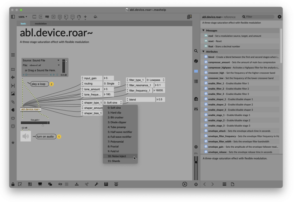 There is a complete version of Roar in this package — abl.dsp.roar~ — which is worth taking a look at first. You could even build a lot of the guts of the full Roar device into an effect with your own desired functionality and UI. And if you add that object in Max for Live and look at the help, you’ll get a glimpse of what it can do. Notice you can even specify shaper types (soft sine, hard clip, bit crusher, fractal, polynomial, etc.):