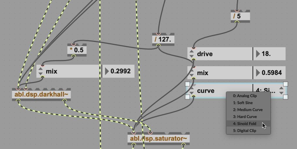 But connect the left-most outlet of the attrui object to the left-most inlet of abl.dsp.saturator~, click on the dropdown, and you’ll see a list of saturator parameters you can control: