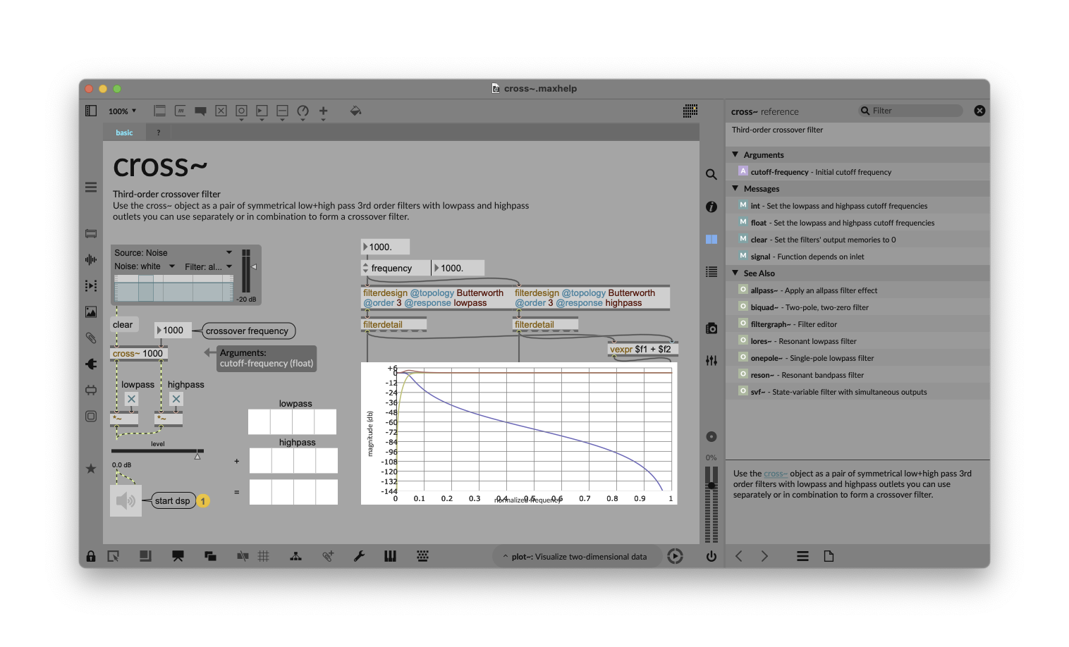 cross~ is mono, so we’ll need two of them for stereo. You don’t need to duplicate every object, though — patch just one number box to the frequency value in Hz, for instance, to link left and right channels.