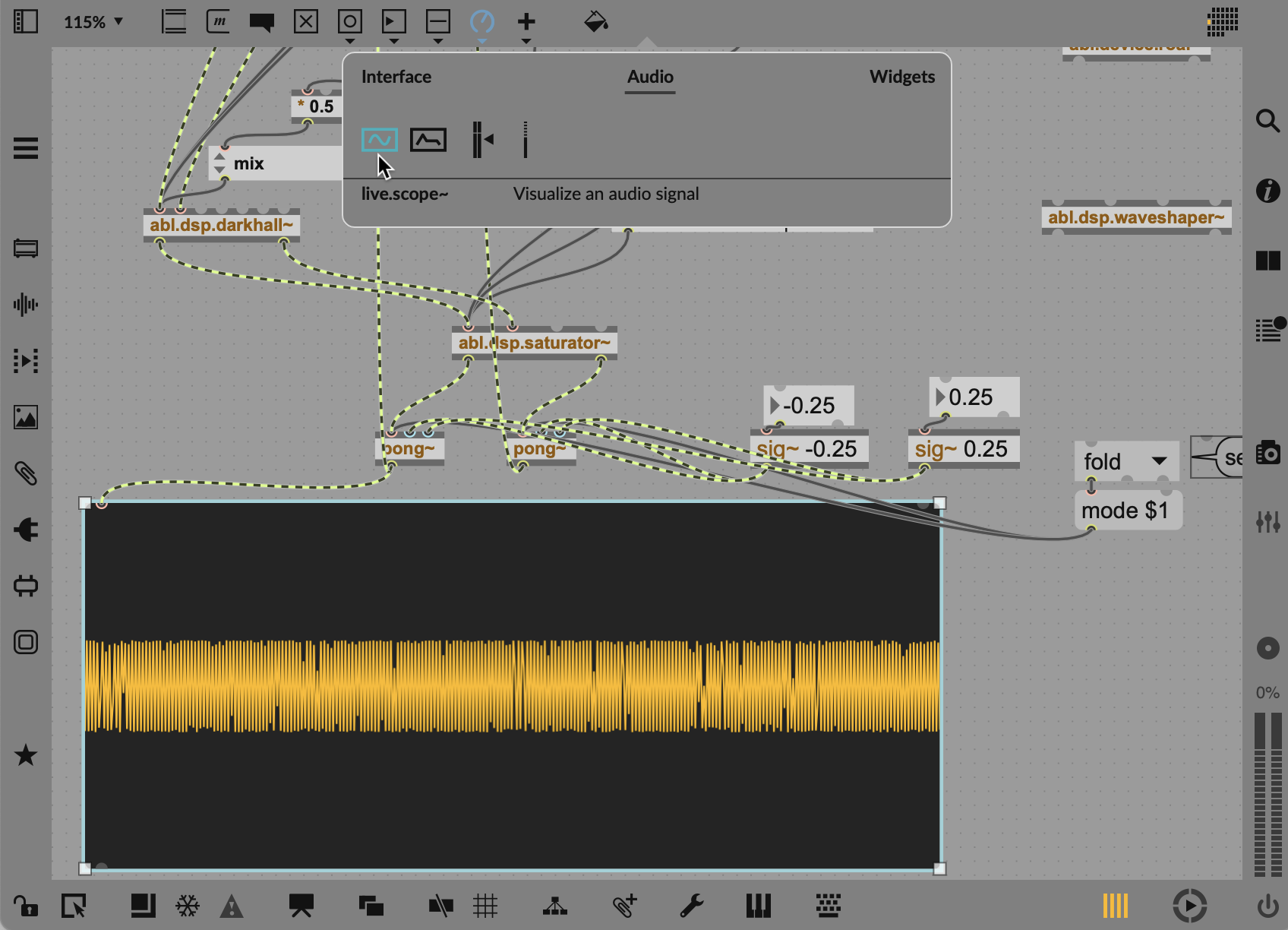 This sounded good, but even wilder if you add a wavefolding stage. I took advantage of the built-in Max object pong~, which performs variable range signal folding. That wavefolder on top of the waveshaper opens up some gnarly possibilities. The help file is really useful here, in that it visualizes the effect with a simple sawtooth wave, as it’s easier to see than it is to describe.