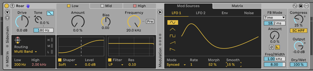 To keep things simple, I’ll focus on how to navigate those extra shapers and manage controls outside of the default Max for Live controls. We’ll set up a crossover to split the signal, then add some different shaping options that aren’t in Roar.