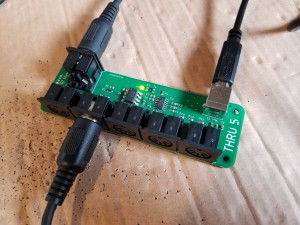 This is the new MeeBlip thru5 kit, a cheep and cheery MIDI splitter
