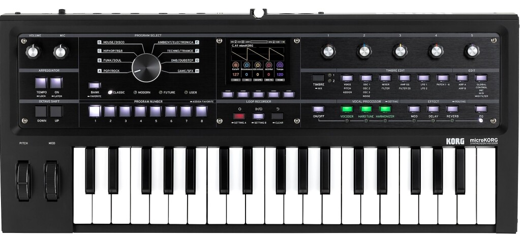 You really want to like the microKORG2, as it’s got a far more refined design, a new sound engine, and a beautiful color display. And it’s clear KORG knew the microKORG market, because they also added in a loop recorder and vocal processor. It got that big dial with easy preset loading that sold the first edition, and you’ve got the gooseneck mic. But it looks and feels more serious.