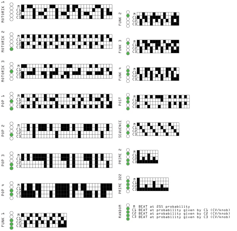 • Performance faders modify the rhythm via three algorithms (Zularic, Numeric, Euclidean)