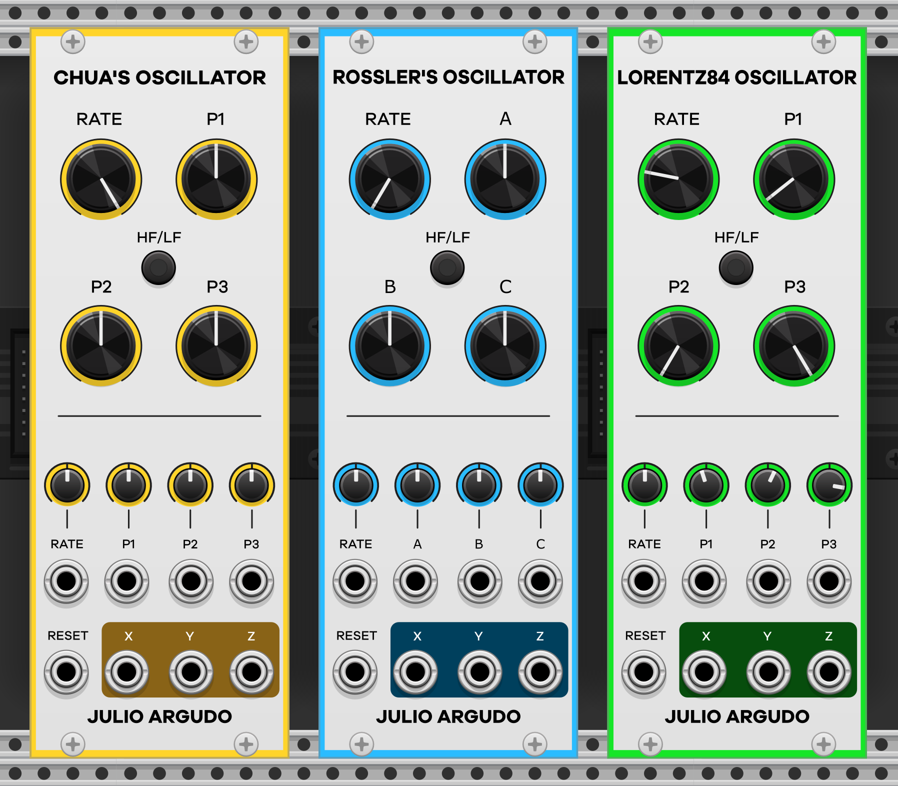 But if you don’t remember integral calculus, you may have come across strange attractors, chaotic non-linear systems with non-periodic results. That means these oscillators, while they are deterministic and not “random,” don’t repeat. The result is beautifully organic timbres, whether you want some life in your synth patches or you’re creating long drones and soundscapes. You’ll hear a more “conventional” oscillator patch in the bass part using the Lorentz oscillator; the other two produce more complex and changing sounds.