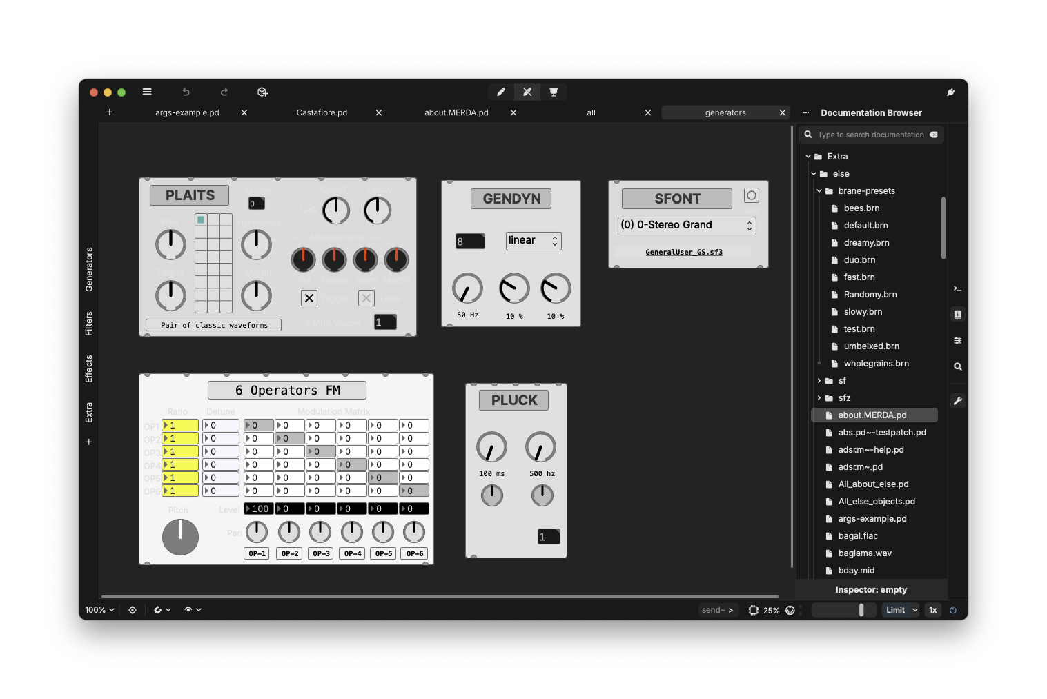 • Other new objects: [float2imp~], [lace], [delace], [lace~], [delace~], [gatehold], [gatedelay],[gatedelay~], [gaterelease~], [gaterelease], [scope3d~], [tanh~], [resonator~], [smooth], [smooth2], [smooth~], [smooth2~], [dbgain~], [level~] plus [crusher.m~], [sfont.m~] and [level.m~] MERDA Modules.
