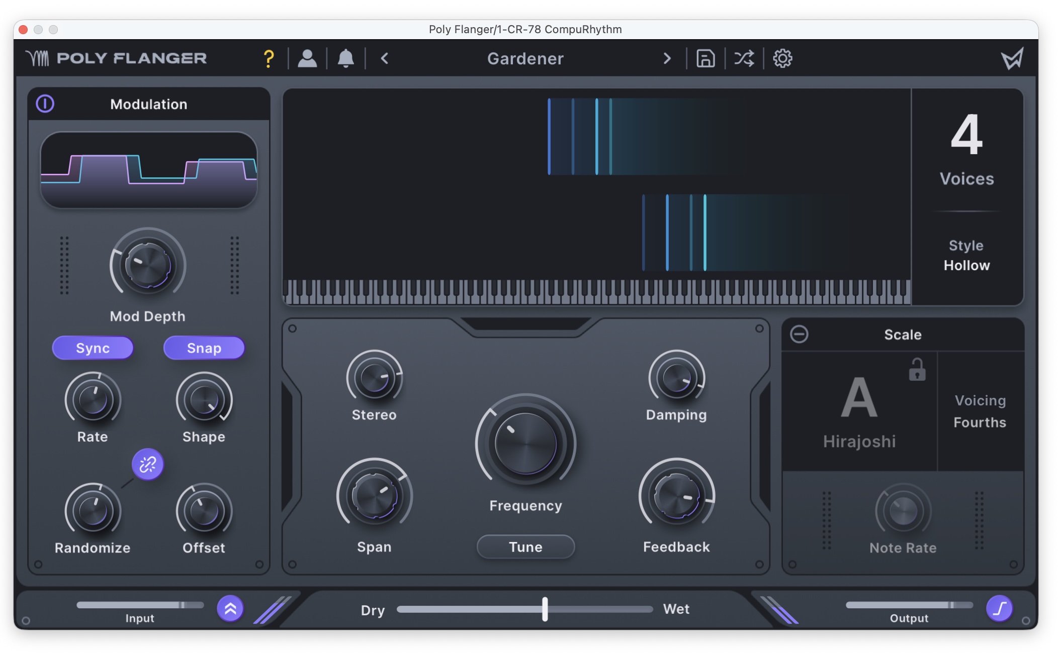 A conventional flanger produces its comb filter by shifting one identical signal by a short modulating period. Poly Flanger expands that idea by allowing you to shift multiple comb filters polyphonically, then tune and articulate them across a scale.