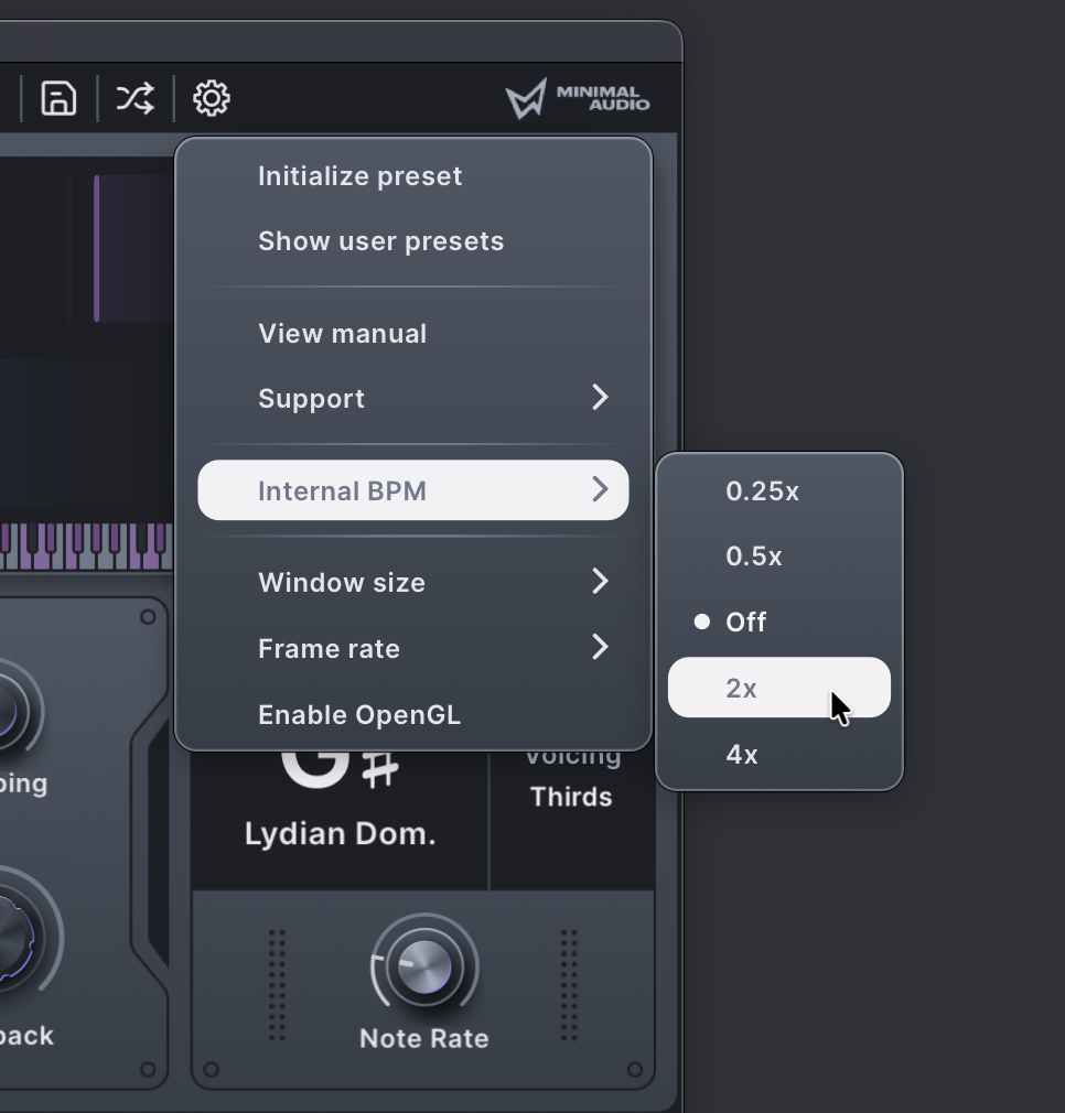 Note that there’s also an internal clock division function under the cog/settings menu at the top right. That lets you run the effect at a quarter, half, 2x, or 4x the rate of your DAW’s project. By the way, owners of other Minimal Audio plug-ins: update your effects, as it was added to their other tools in the most recent update, too!