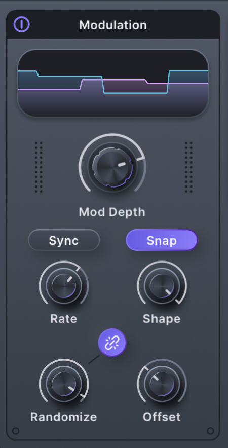 Modulation is applied to Frequency/Pitch via the Modulation section, either free-running Rate or clocked (Sync). Shape offers sine, triangle, downward ramp, and square shapes. With Snap off, this knob morphs between them continuously. With Snap on, you get just those pure shapes.