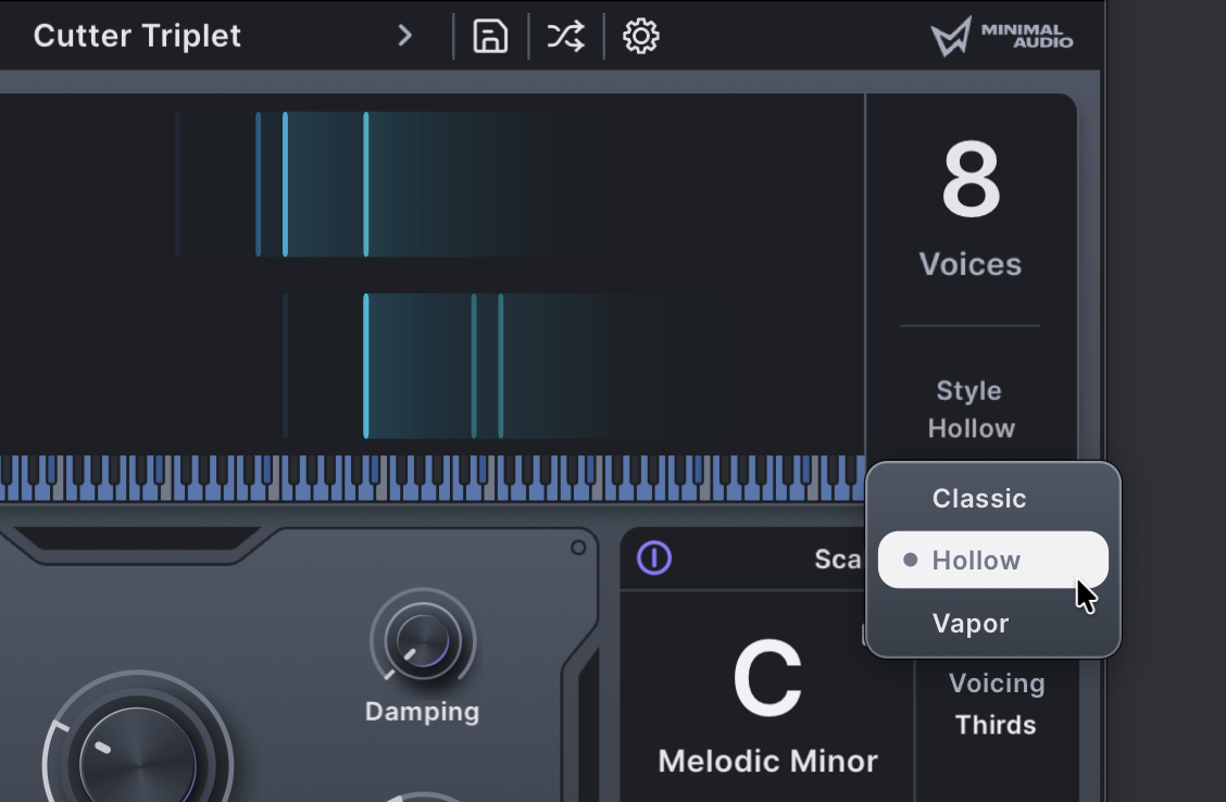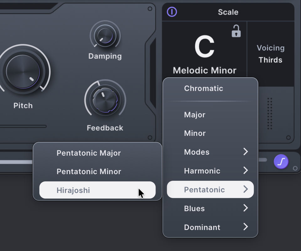 You also get this handy voicing menu. Don’t worry about your theory knowledge here — I have plenty of theory training and I just experimented. These don’t have to presume particularly harmonic music, either; they work well across modal and experimental sounds, too.