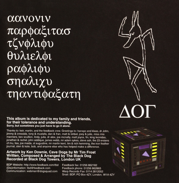 From the start, The Black Dog mashed together ancient history and the future in a kind of cyber-Egyptology. When I spoke to Plaid in 2024, Andy Turner broke it down as such: “I think with the Black Dog stuff, there was an interest in finding out about things. Ken was an Egyptologist – or, he studied as a hobbyist, so he had a lot of knowledge there. When we met him, we were gathering a lot of knowledge from him.”