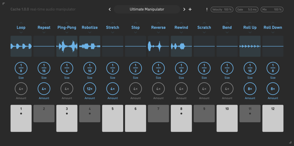 Here’s how it works. First, divide the buffer into 12. Each zone has a size control (time duration) and its own algorithm for performing different sound-manipulation tricks. (Some also have an amount control, determining how much of that sound slice duration gets used.)
