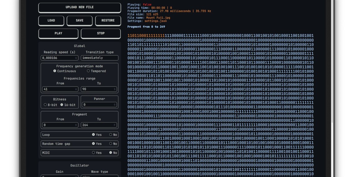 01000011 01101111 01101111 01101100 00100001! Binary Synth runs in your browser, and translates any binary file from its zeros and ones into audio synthesis and MIDI messages. The code is available under an MIT license, too, if you want to play with it.