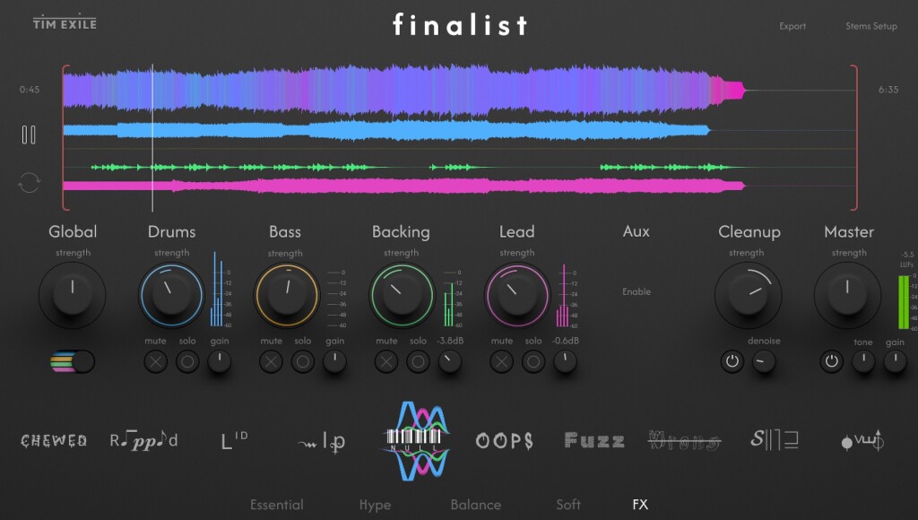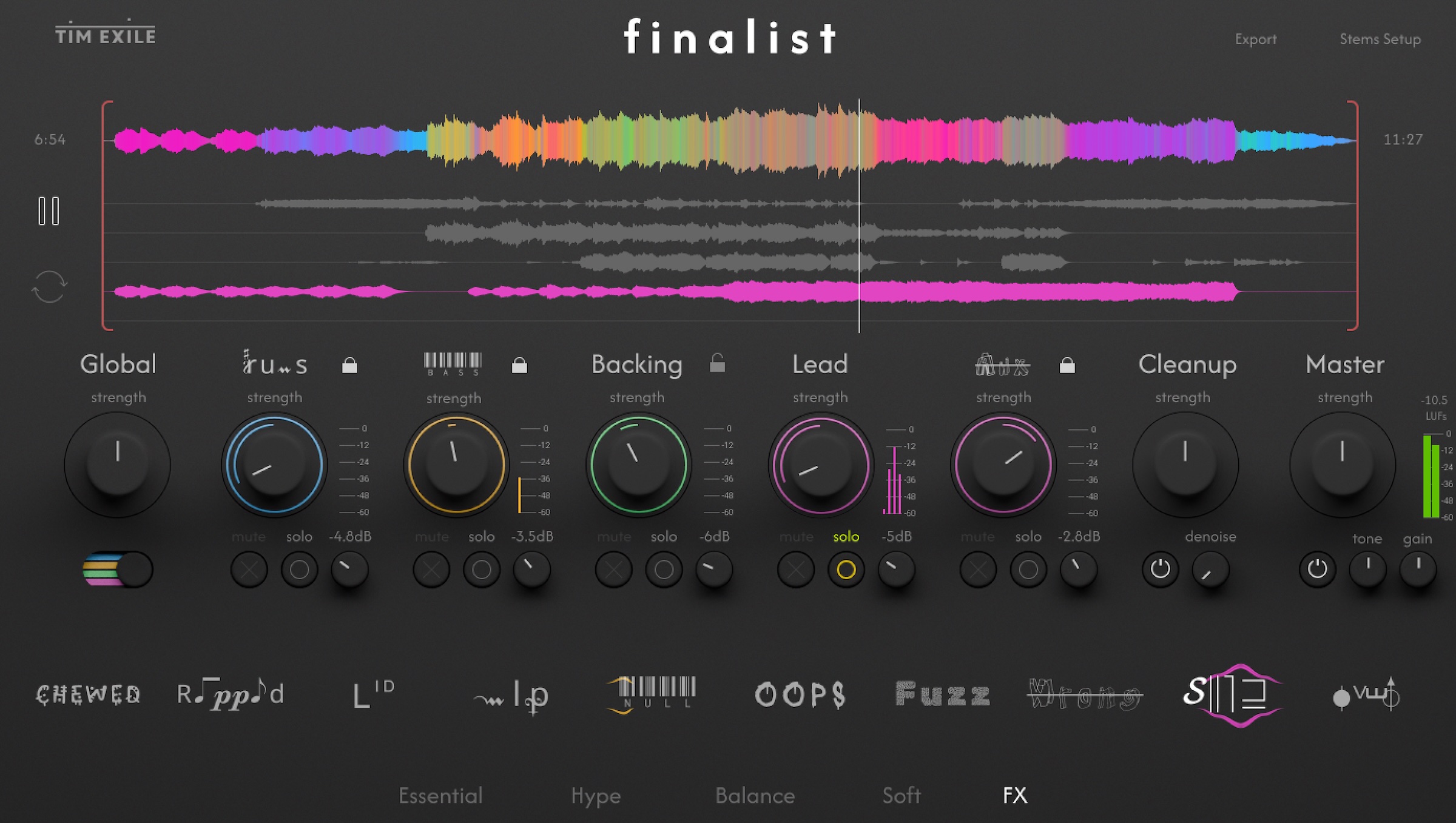 Once you have your stems in place, you just pick different filters and go. And they all have fun and inventive names, like TikTok or Instagram filters. Finalist’s results tended to be a little squashed for me, so I tended to turn down the gain on individual parts. Some of the presets will create some overzealous coloration or even audible distortion, but that’s sort of the fun of it — really, like Instagram presets. And some do land on pretty nice mixes. You can then adjust pan and tailor the amounts.