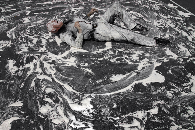 Quite a few of this crowd are wonderfully multitalented performance and multimedia artists, not just music producers per sé. Take Nigel Rolfe, who this week is profiled by The Irish Times with the superb opening line, “Nigel Rolfe has been seen naked covered only in paint, dressed in a crisp white shirt plunging into the dark waters of a peat bog, wrapping his head in rope, and raising a gold-leafed fist to the world.” (Above: Nigel Rolfe, Live Action 10, Gothenburg, Sweden, 2015, from his site.)